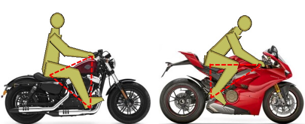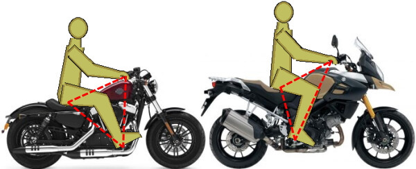 The images compare the rider triangle on the Harley Davidson Forty-Eight, a pretty popular cruiser, to the sitting position on a standard, adventure touring, and sport motorcycle (in this case, the Triumph Street Twin, the Suzuki V-Strom, and the Ducati Panigale V4, respectively.)